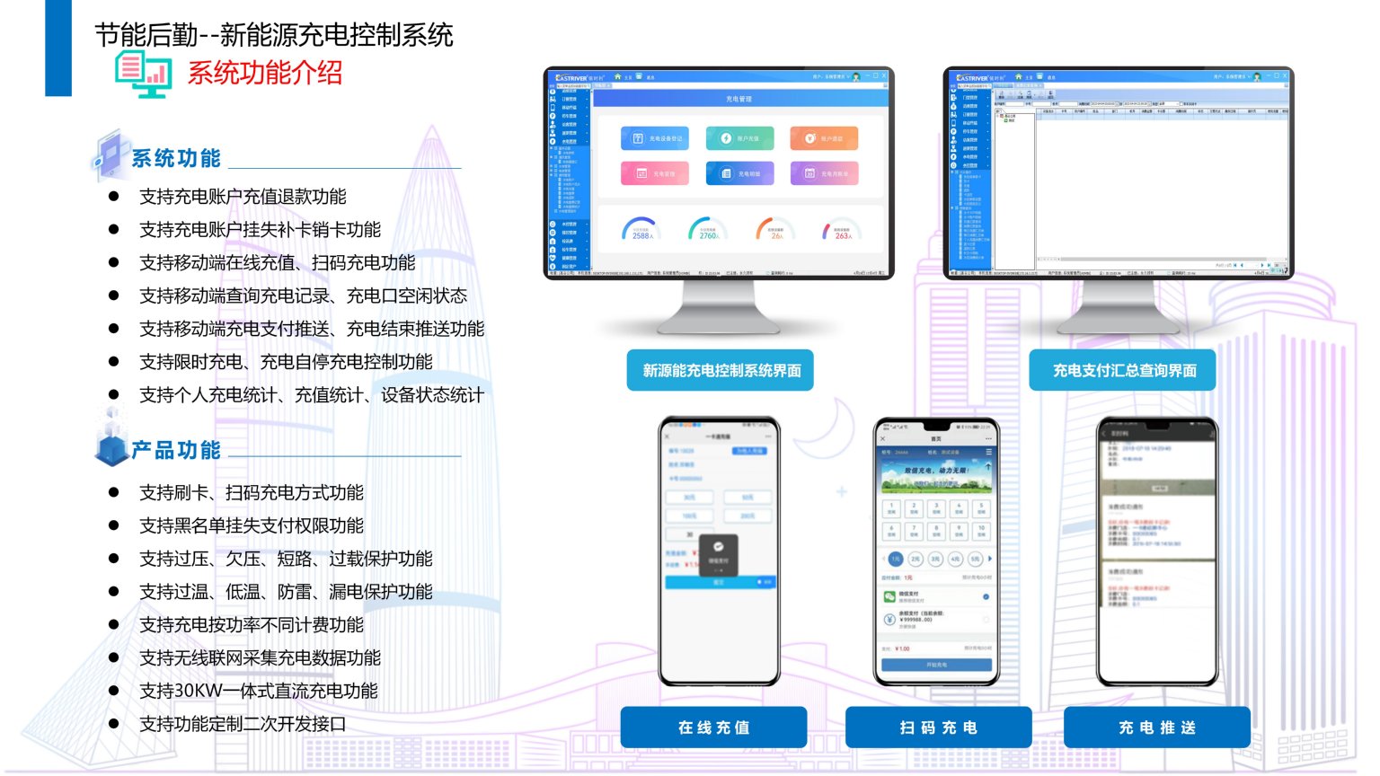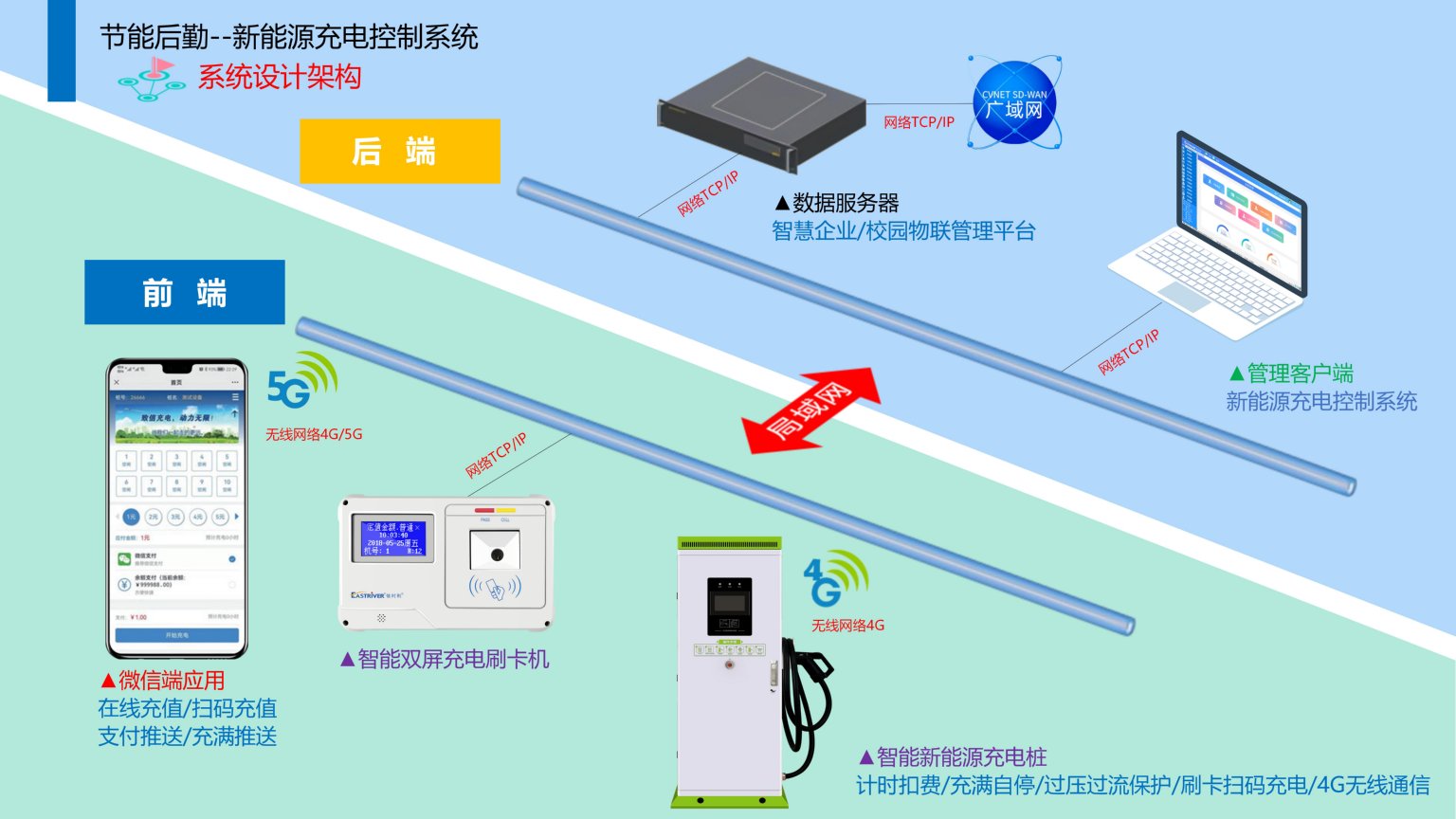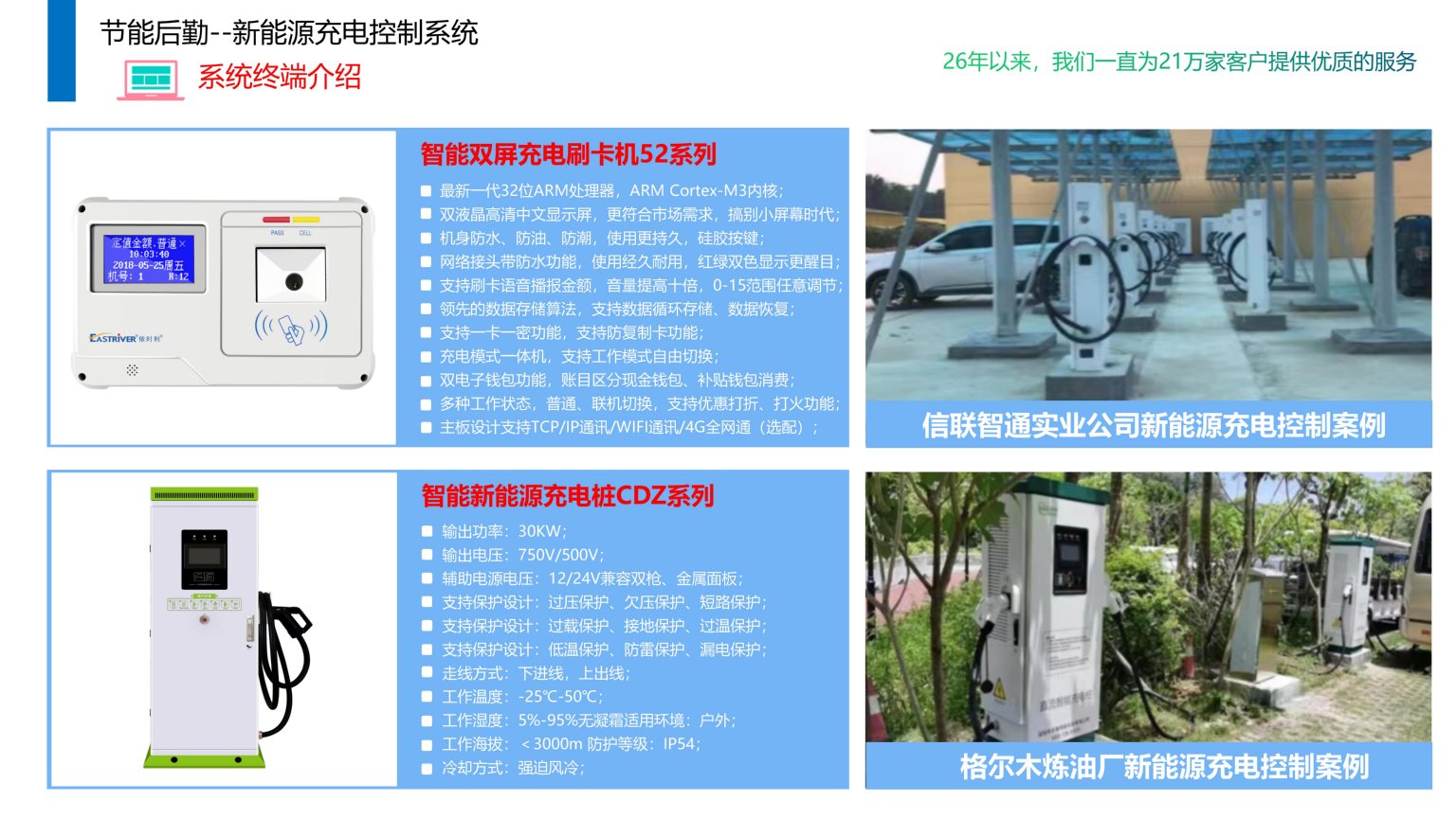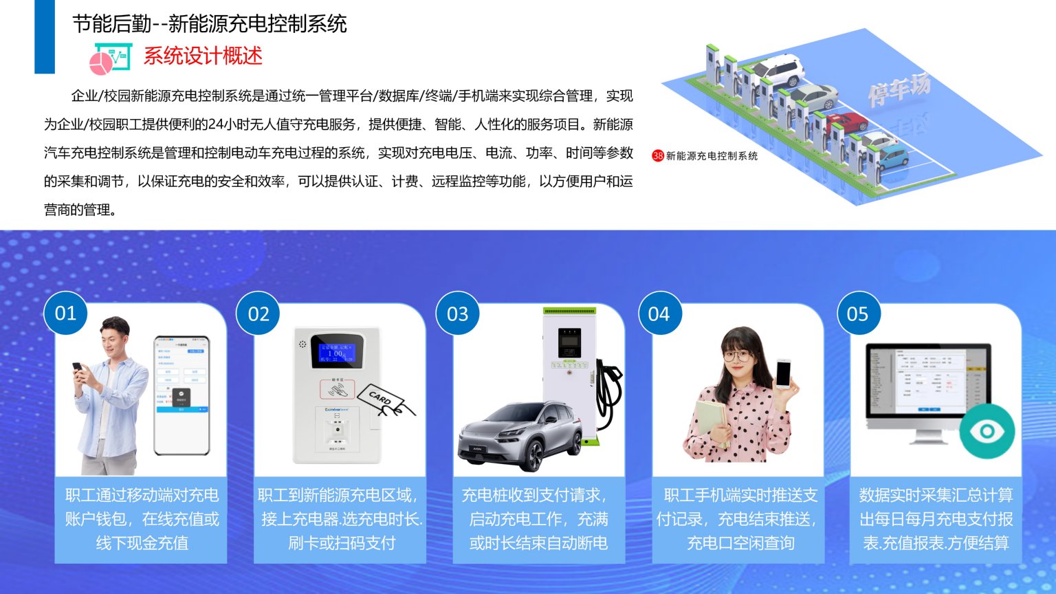 依时利企业/校园新能源充电控制系统是通过统一管理平台/数据库/终端/手机端来实现综合管理,实现为企业/校园职工提供便利的24小时无人值守充电服务,提供便捷、智能、人性化的服务项目。新能源汽车充电控制系统是管理和控制电动车充电过程的系统,实现对充电电压、电流、功率、时间等参数的采集和调节,以保证充电的安全和效率,可以提供认证、计费、远程监控等功能,以方便用户和运营商的管理。
