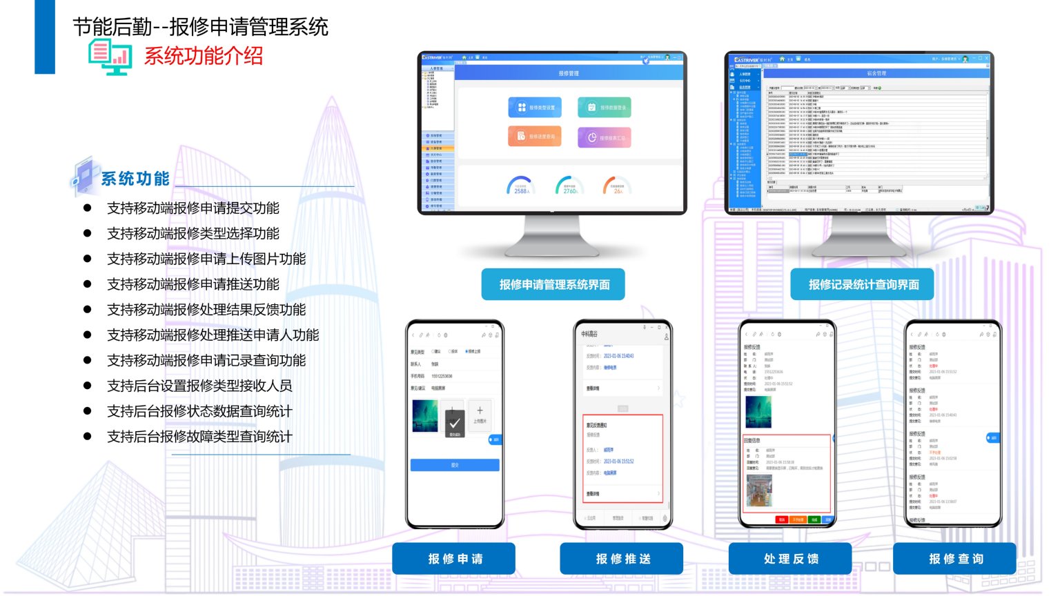 依时利企业/校园报修申请管理系统是通过统一管理平台/数据库/终端/手机端来实现综合管理,为企业/校园职工提供便捷移动端一键报修申请,报修信息实时推送检修人员与管理人员,信息精准一步传达,避免耽误宝贵的维修时间给企业/校园造成更多的损失。报修过程透明化设计,在报修的各个环节上提供微信消息提醒功能,不管是管理员、检修人员还是申请人,都不会错过任何报修的环节。报表统计分析更加的全面,包含故障类型、报修区域、维修耗材、报修状态、完成情况等数据分析与导出。