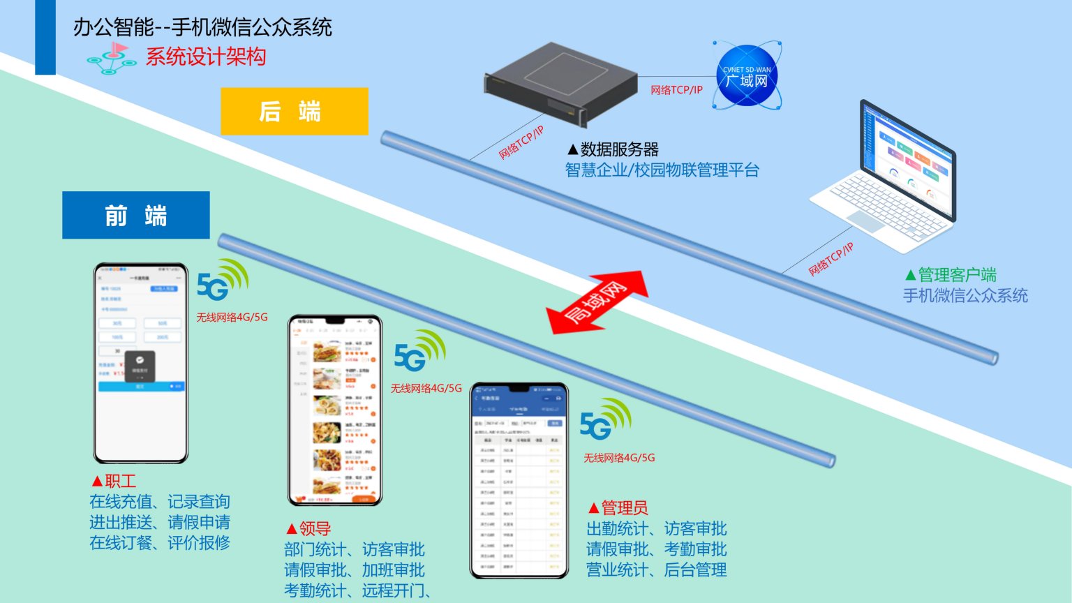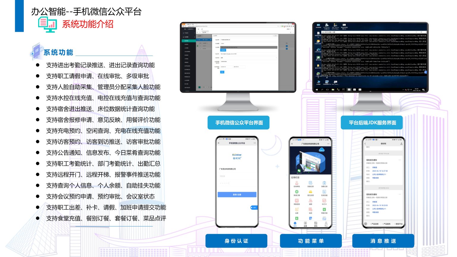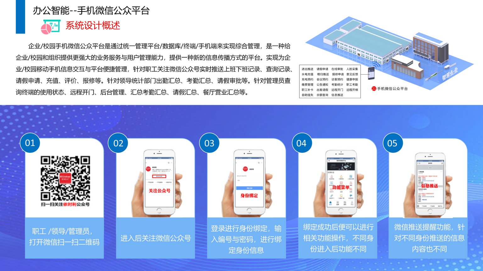 依时利企业/校园手机微信公众平台是通过统一管理平台/数据库/终端/手机端来实现综合管理,是一种给企业/校园和组织提供更强大的业务服务与用户管理能力,提供一种新的信息传播方式的平台。实现为企业/校园移动手机信息交互与平台便捷管理,针对职工关注微信公众号实时推送上班下班记录、查询记录、请假申请、充值、评价、报修等。针对领导统计部门出勤汇总、考勤汇总、请假审批等。针对管理员查询终端的使用状态、远程开门、后台管理、汇总考勤汇总、请假汇总、餐厅营业汇总等。